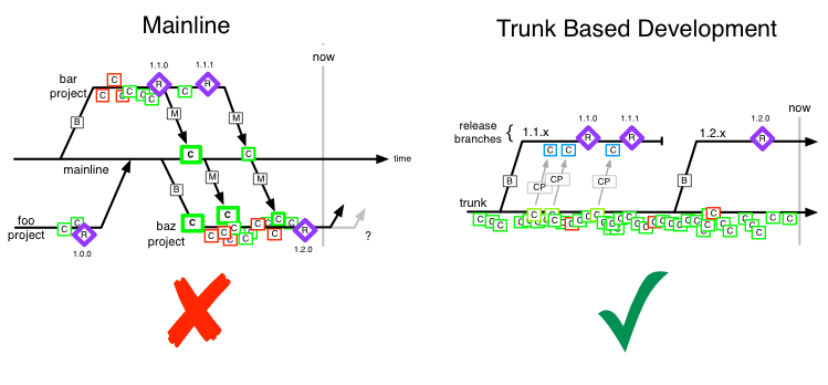 前面提到基于特性分支开发模式的各种workflow有一个缺陷是很容易产生长期存在的特性分支,导致合并时常常产生冲突,另一种模型主干开发模式(Trunk Based Development)即可解决这个问题: